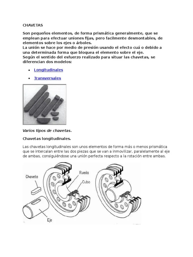 Ligação por chaveta aplicável para articular o veio e o cubo. 29.08.2016 · chaveta a chaveta tem corpo em forma prismática ou cilíndrica que pode ter faces paralelas ou inclinadas, em função da grandeza do esforço e do tipo de movimento que deve transmitir. Alguns autores classificam a chaveta como elementos de fixação e outros autores, como elementos de transmissão. Asegura el mejor centrado del eje y la pieza rozante, permitiendo realizar uniones inmóviles, como también, uniones resbaladizas.. Asegura el mejor centrado del eje y la pieza rozante, permitiendo realizar uniones inmóviles, como también, uniones resbaladizas.