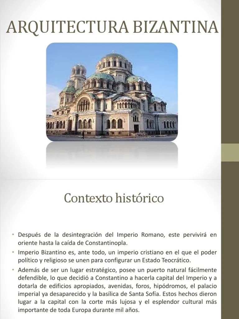 Se denomina arquitectura bizantina al estilo arquitectónico que estuvo vigente durante el imperio bizantino (imperio romano de oriente) desde la caída del imperio romano de occidente en el siglo v. Constantino trasladó la capital del imperio , desde las orillas del tíber, en roma, a las orillas del bósforo, en constantinopla. Dada la supremacía económica de la zona oriental, la mejor situación estratégica frente a la presión de los pueblos bárbaros y al mayor empuje del cristianismo en estos. Jun 19, 2010 · arquitectura bizantina. Arte bizantino y romanico froi j suarez. Se denomina arquitectura bizantina al estilo arquitectónico que estuvo vigente durante el imperio bizantino (imperio romano de oriente) desde la caída del imperio romano de occidente en el siglo v. Diapositivas online paleocristiano bizantino y romanico therufianx. Arquitectura romanica, gotica y bizantina.. Diapositivas online paleocristiano bizantino y romanico therufianx.